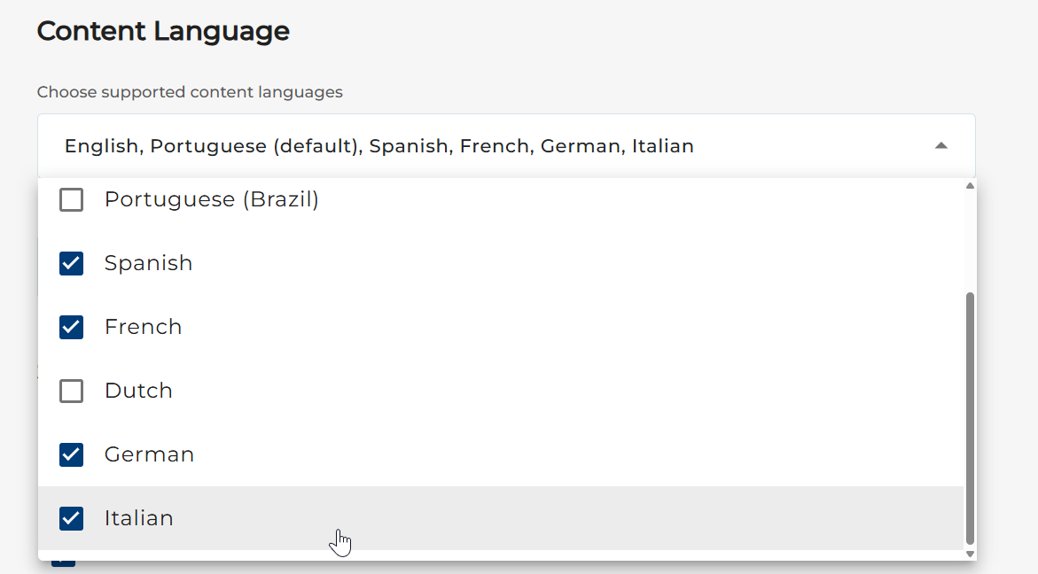For now there are 8 languages available, which you can select on Global Settings > Content Language.