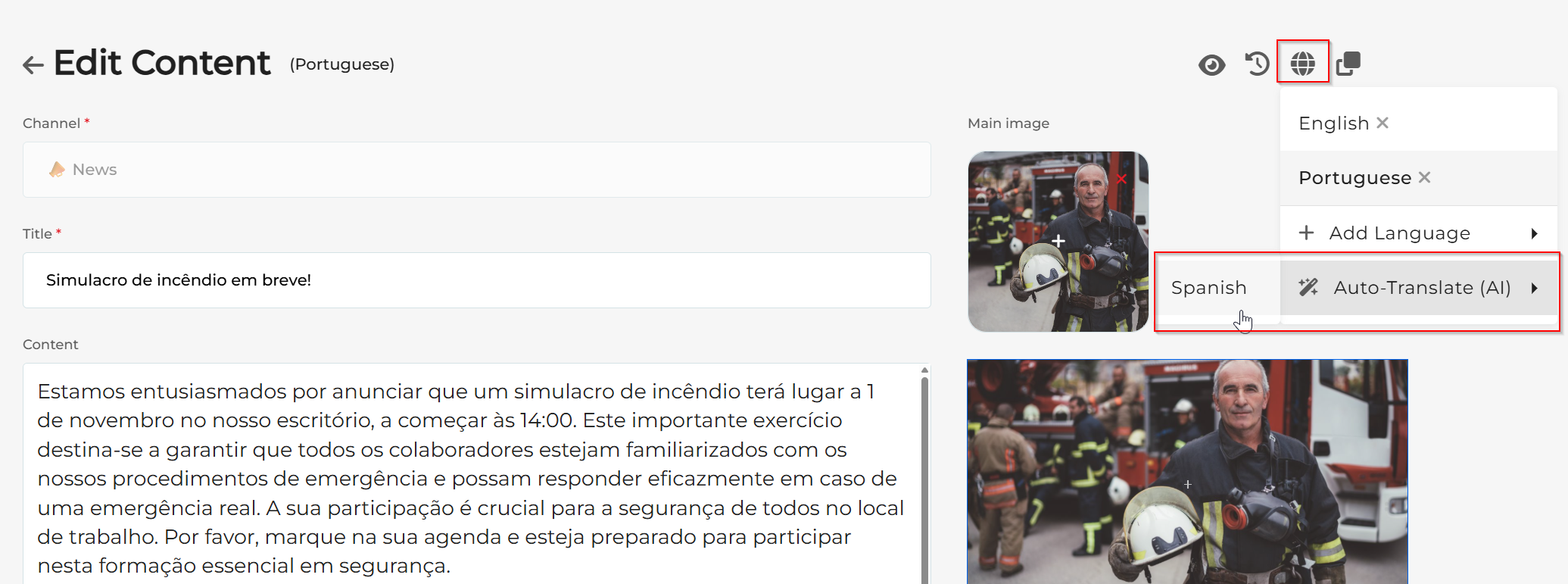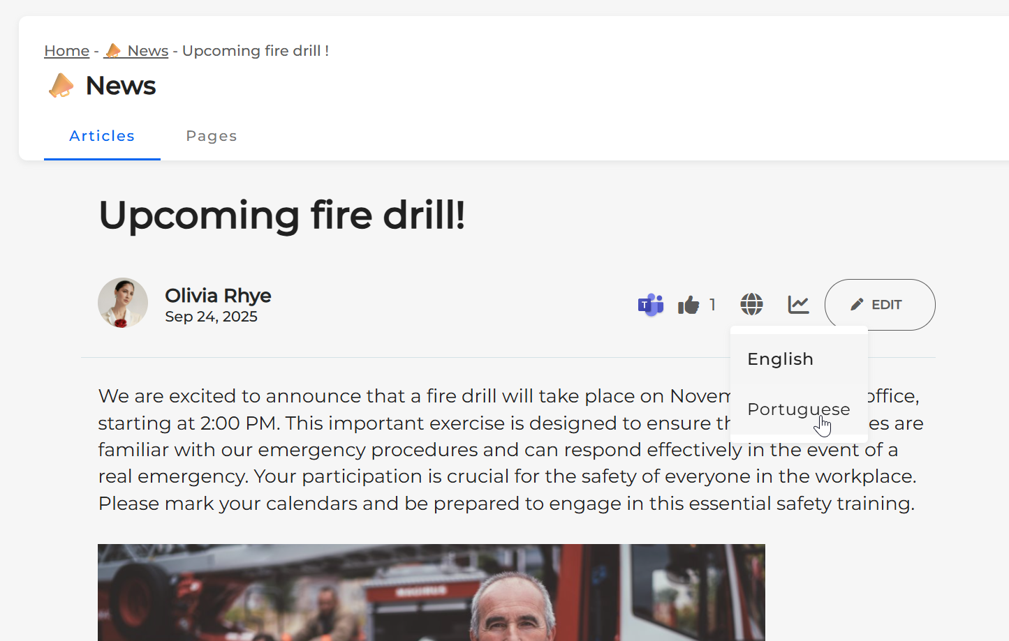 Articles and Pages can be manually and automatically translated to other languages used in your organization.